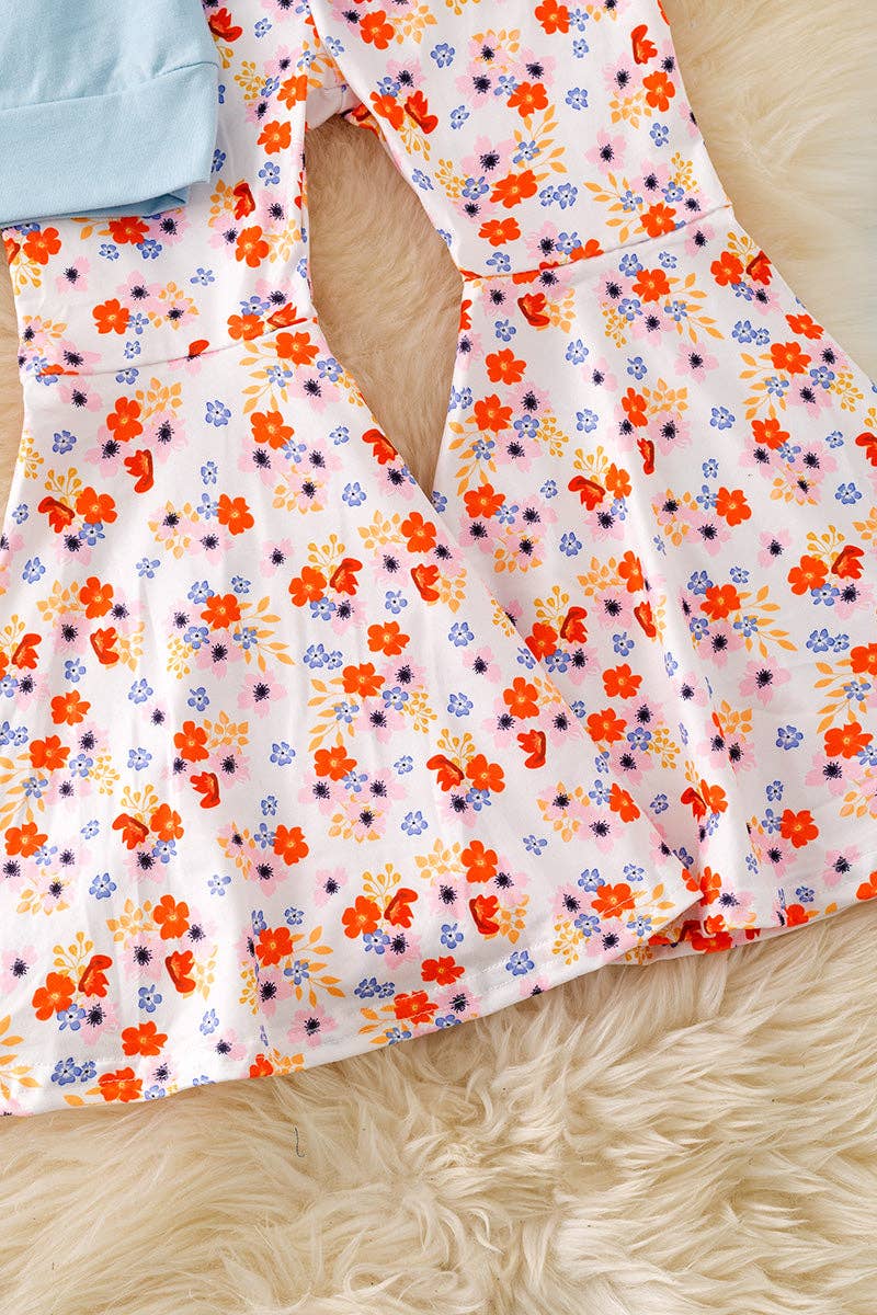 This charming girls' outfit features a light blue sweatshirt adorned with a playful "Boo" applique, perfectly paired with floral bell-bottom pants. The soft sweatshirt offers cozy comfort, while the vibrant floral flares add a stylish, retro-inspired touch. Ideal for casual wear, this set combines fun design with practical comfort for everyday adventures.