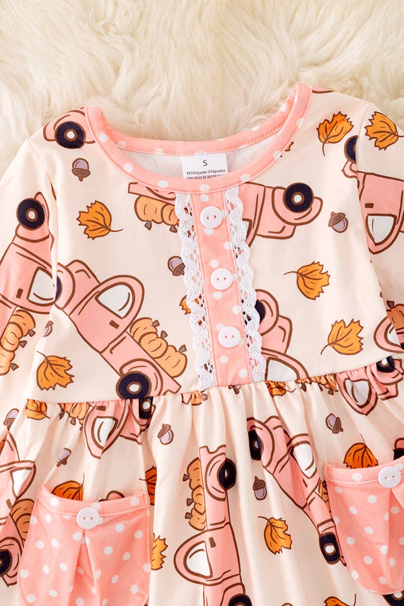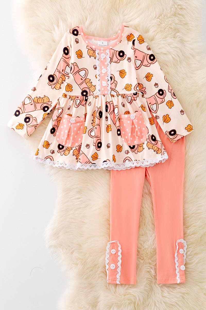 This Fall printed tunic with lace detailing is made of 95% polyester and 5% spandex, ensuring a comfortable and stretchy fit. The accompanying leggings are made of 97% cotton and 3% spandex for ultimate softness and flexibility. Perfect for a stylish and cozy ensemble.