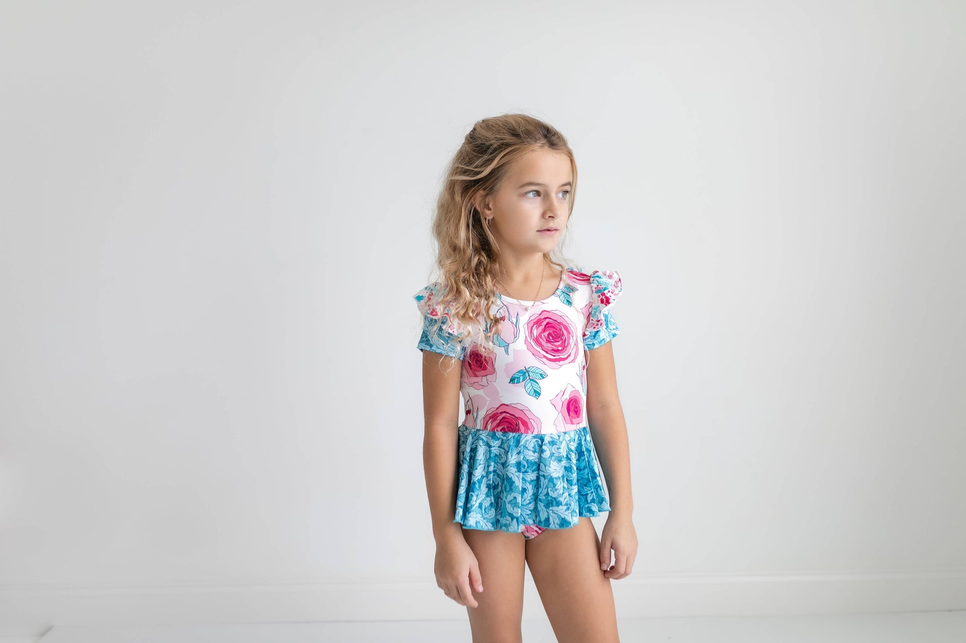 Leo Luvs Teal, Blue, and Pink Floral Print Short Sleeve Skirted Leotard. Cutest ruffle accents. Perfect for twirling at Dance, Tumble, Ballet, and Gymnastics!