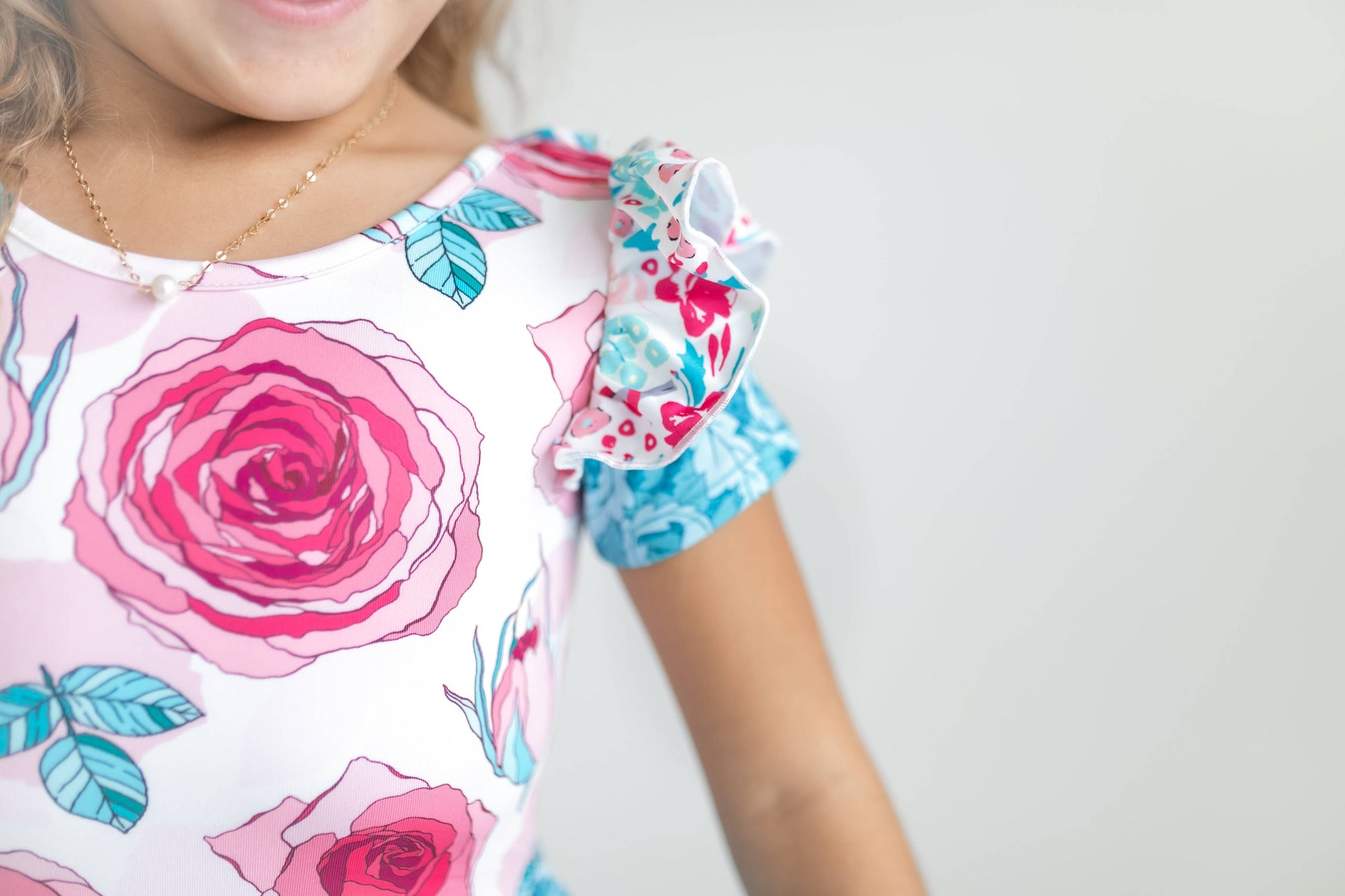 Kids Teal & Pink Rose Dance Gymnastics Skirted Twirl Leotard