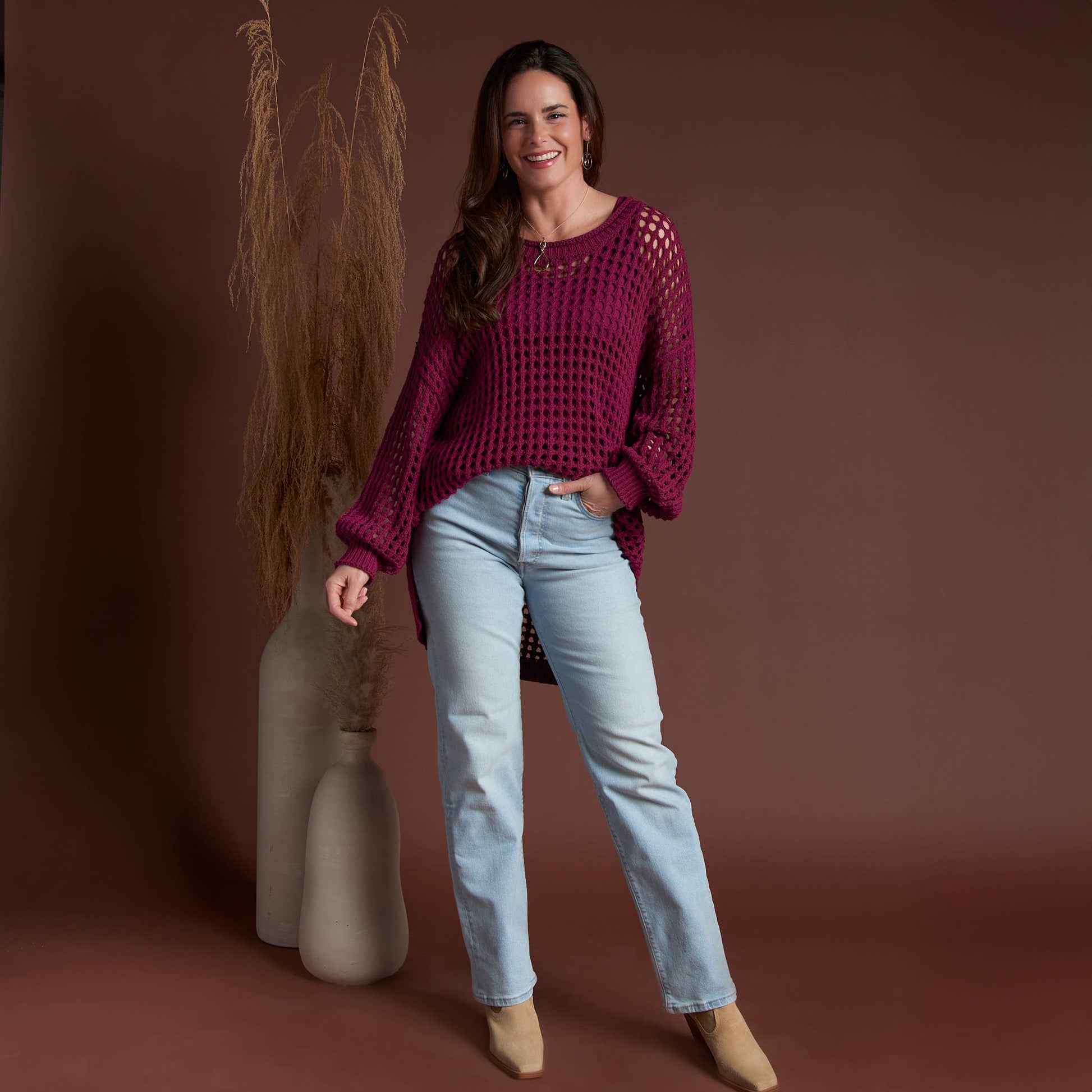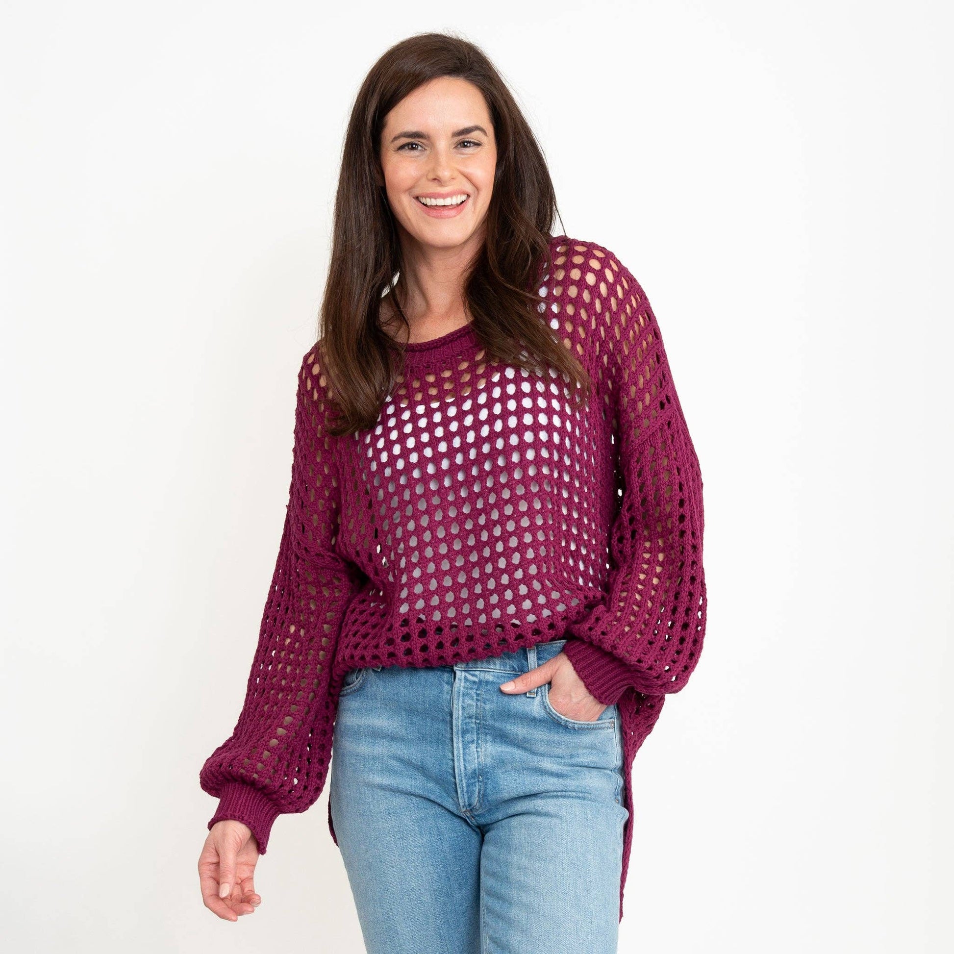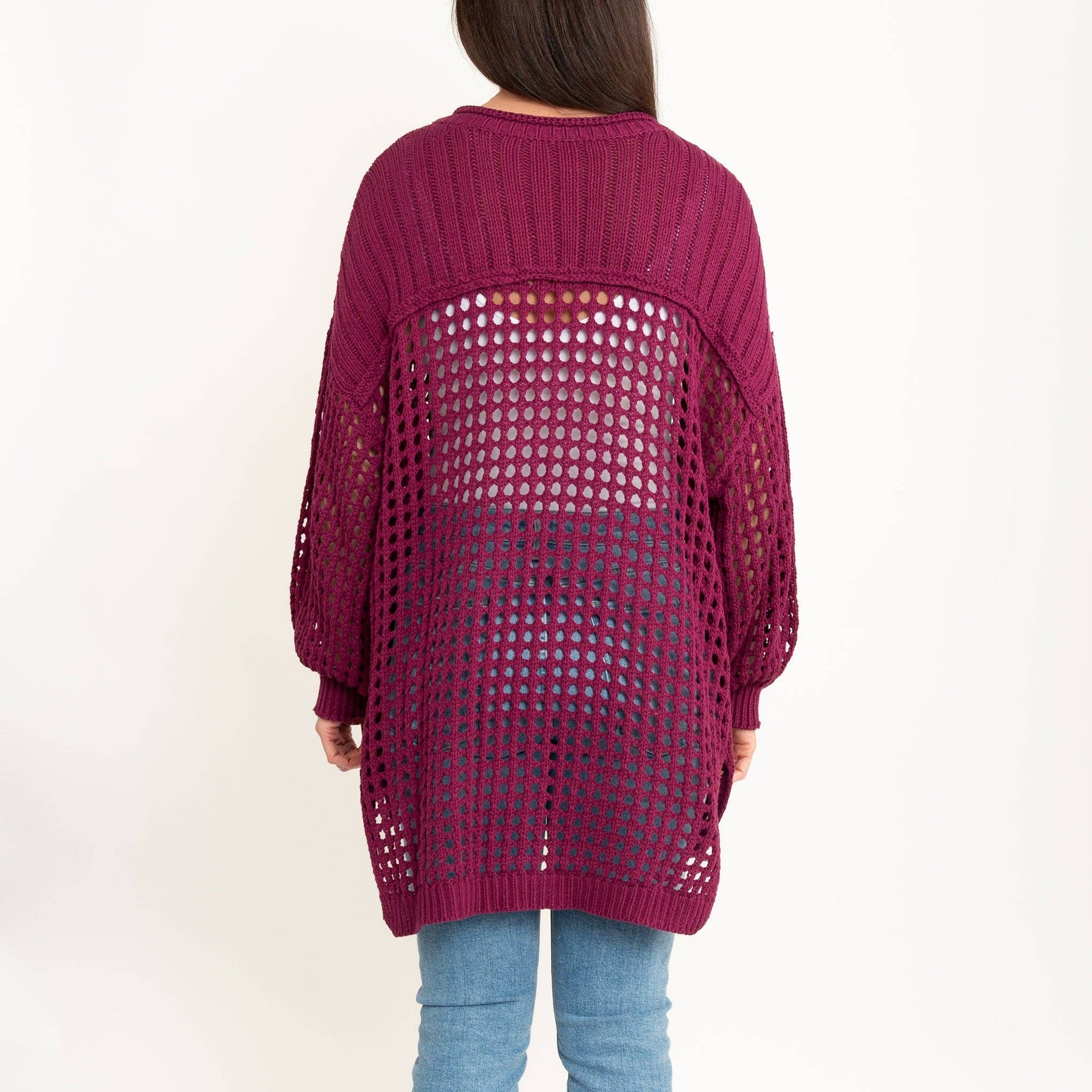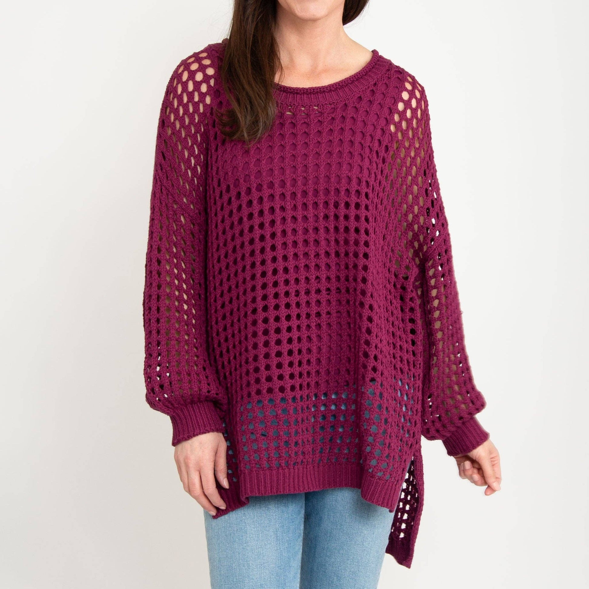 A wardrobe staple, the Olli Crochet Sweater features a gorgeous deep berry with open knit crochet design and comfortable, oversized fit with a high-low hem. Lightweight and easy to wear, this sweater goes with everything!