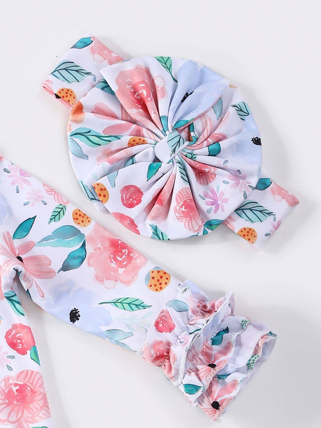 Sewn ruffle around the bottom and sleeves and matching headband!
