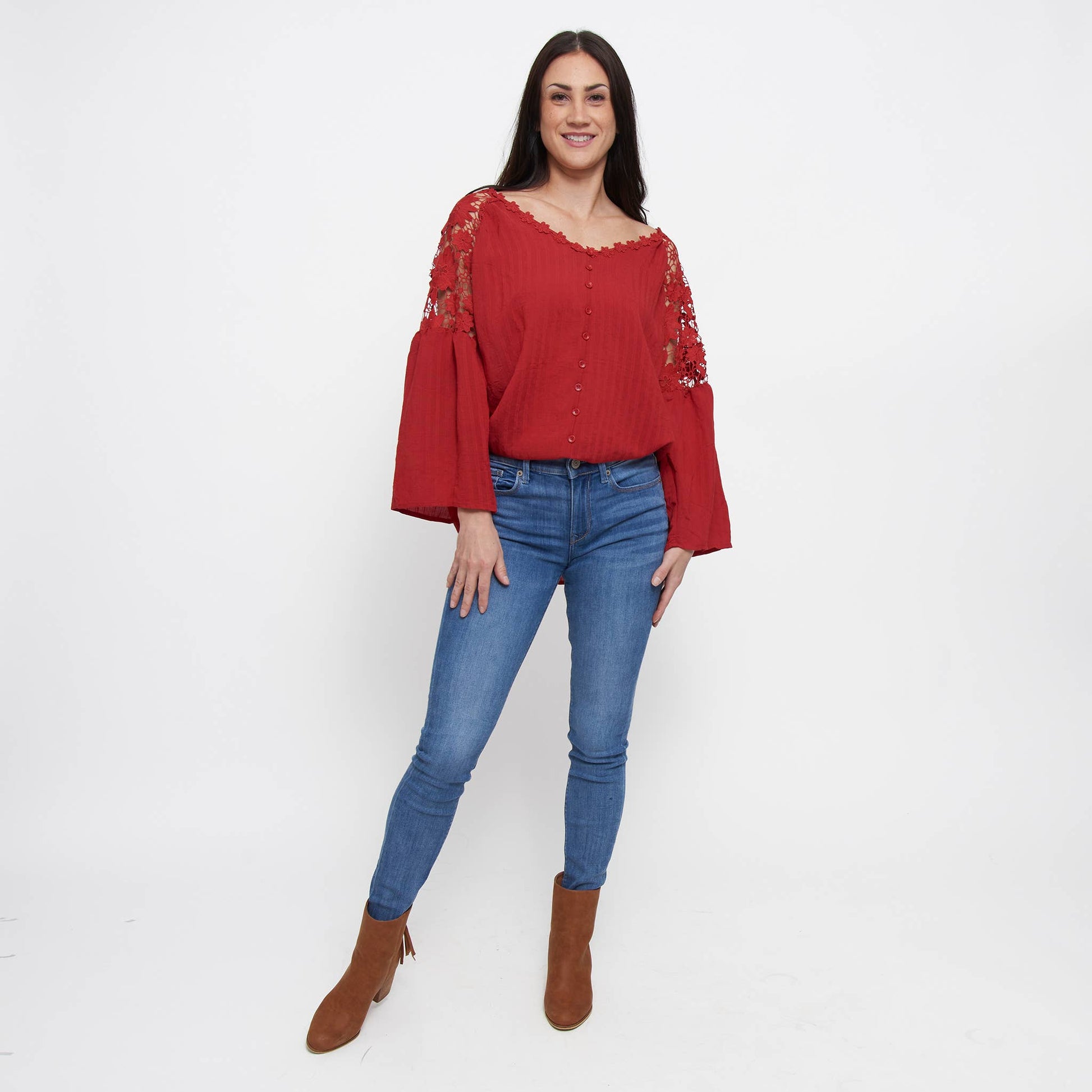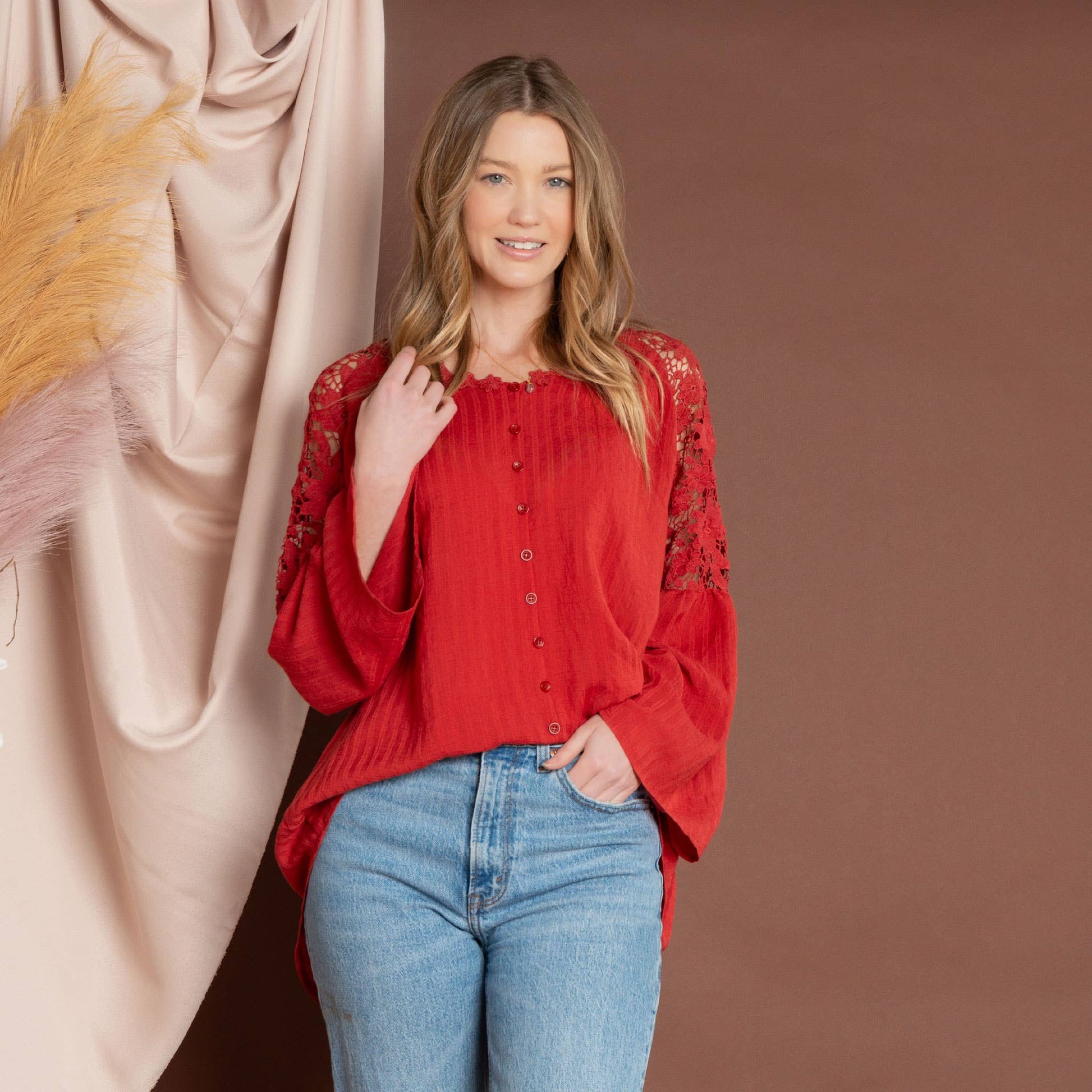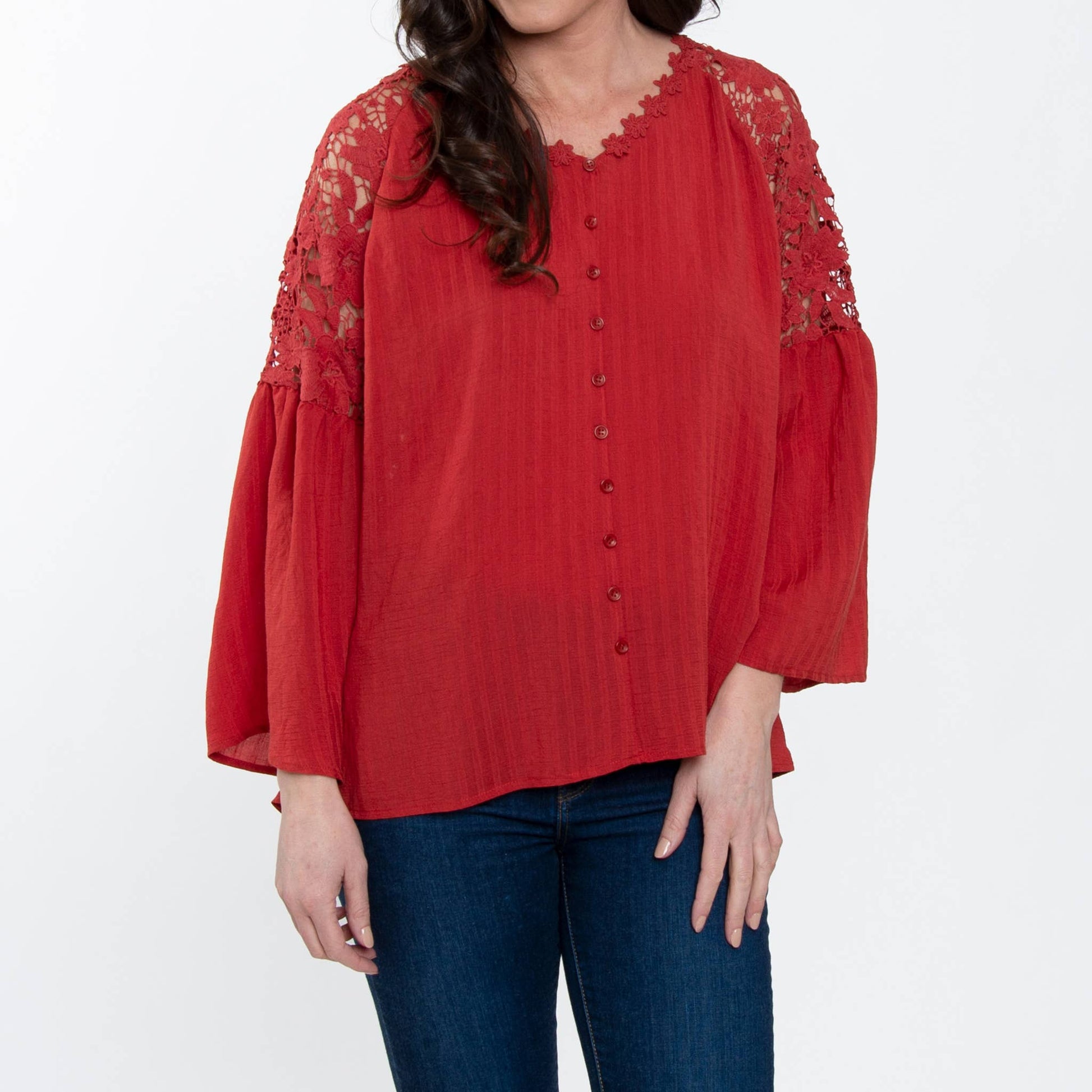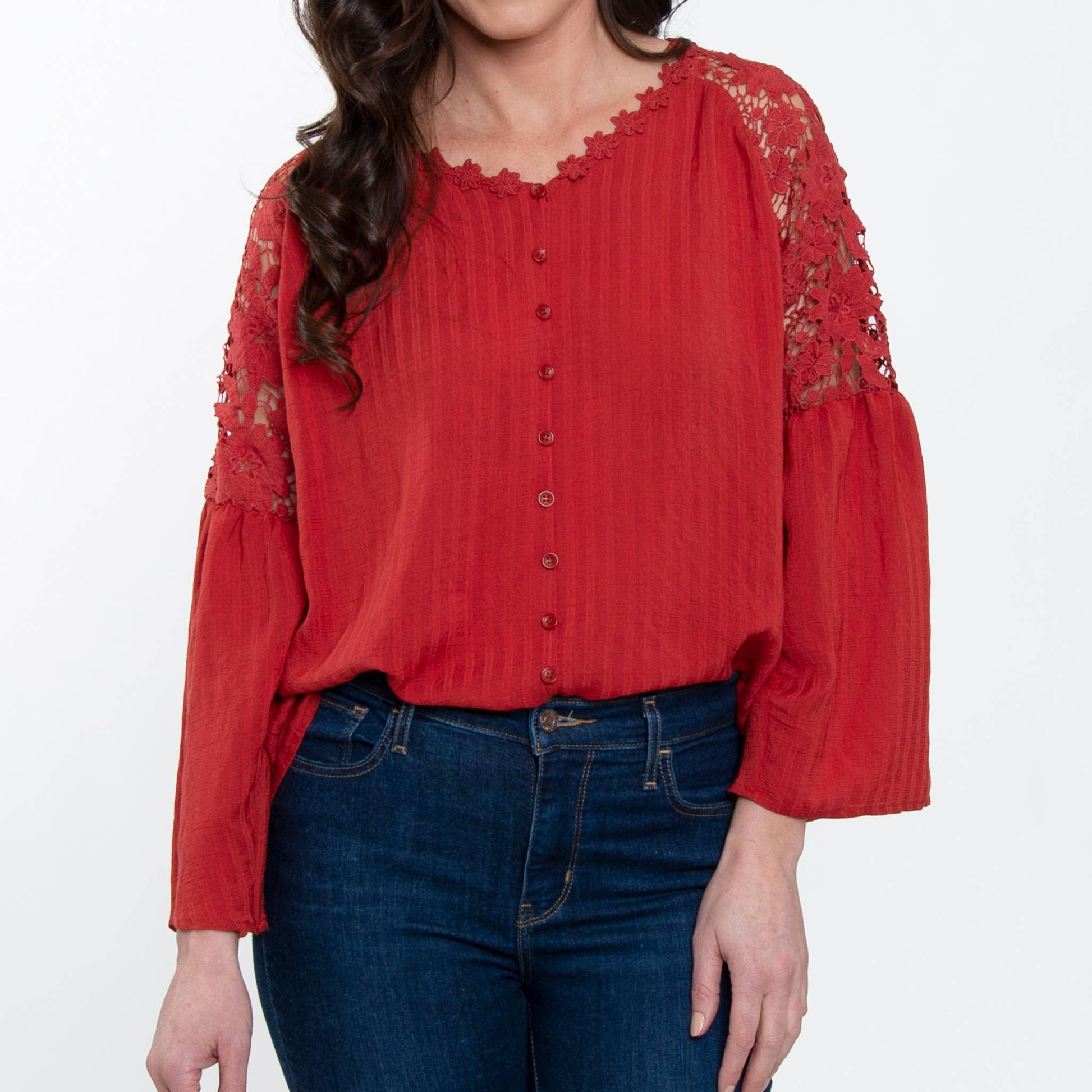 Add a bit of pizazz to your wardrobe with the Mckenna Lace Sleeve V-Neck Blouse. Featuring a classic tone with gorgeous lace detailing, an open lace back, and faux buttons along the front, this blouse makes for the perfect fall layer.
